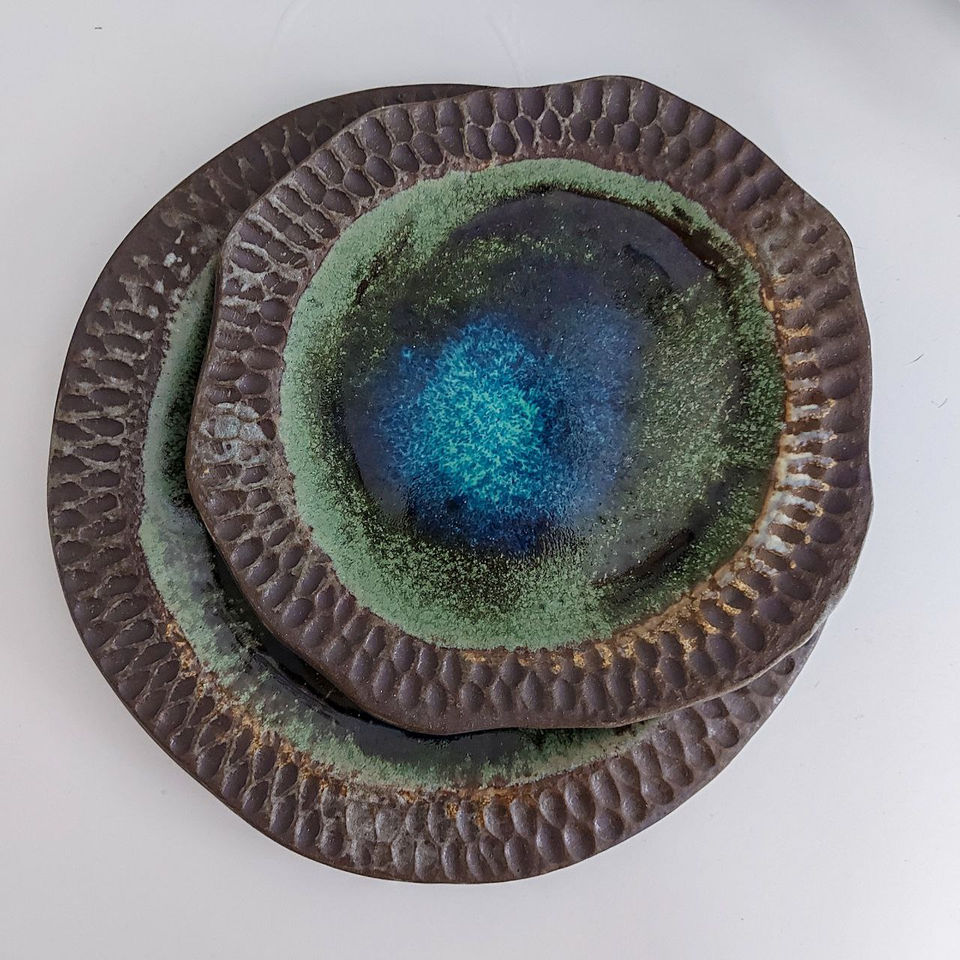 Wykonaj zestaw dwóch talerzy z beżowej lub ciemnobrązowej gliny w nieregularnych kształtach, uzupełnionych nadrukowanymi wzorami pokrytymi żywym szkliwem w nowoczesnym lub klasycznym stylu. Niezależnie od tego, czy będą używane do przyjmowania gości, czy do codziennych posiłków w domu, ręcznie robione talerze podniosą jakość Twojego doświadczenia przy stole.